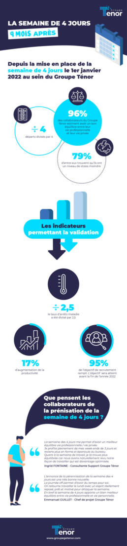Après une phase expérimentale de 9 mois où le Groupe Ténor souhaitait d’abord constater les premiers résultats et mesurer les bénéfices pour ses collaborateurs, l’entreprise annonce sa décision d’acter définitivement la semaine des 4 jours pour l’ensemble de ses collaborateurs. Découvrez les indicateurs ayant permis cette décision dans notre infographie ci-dessous.